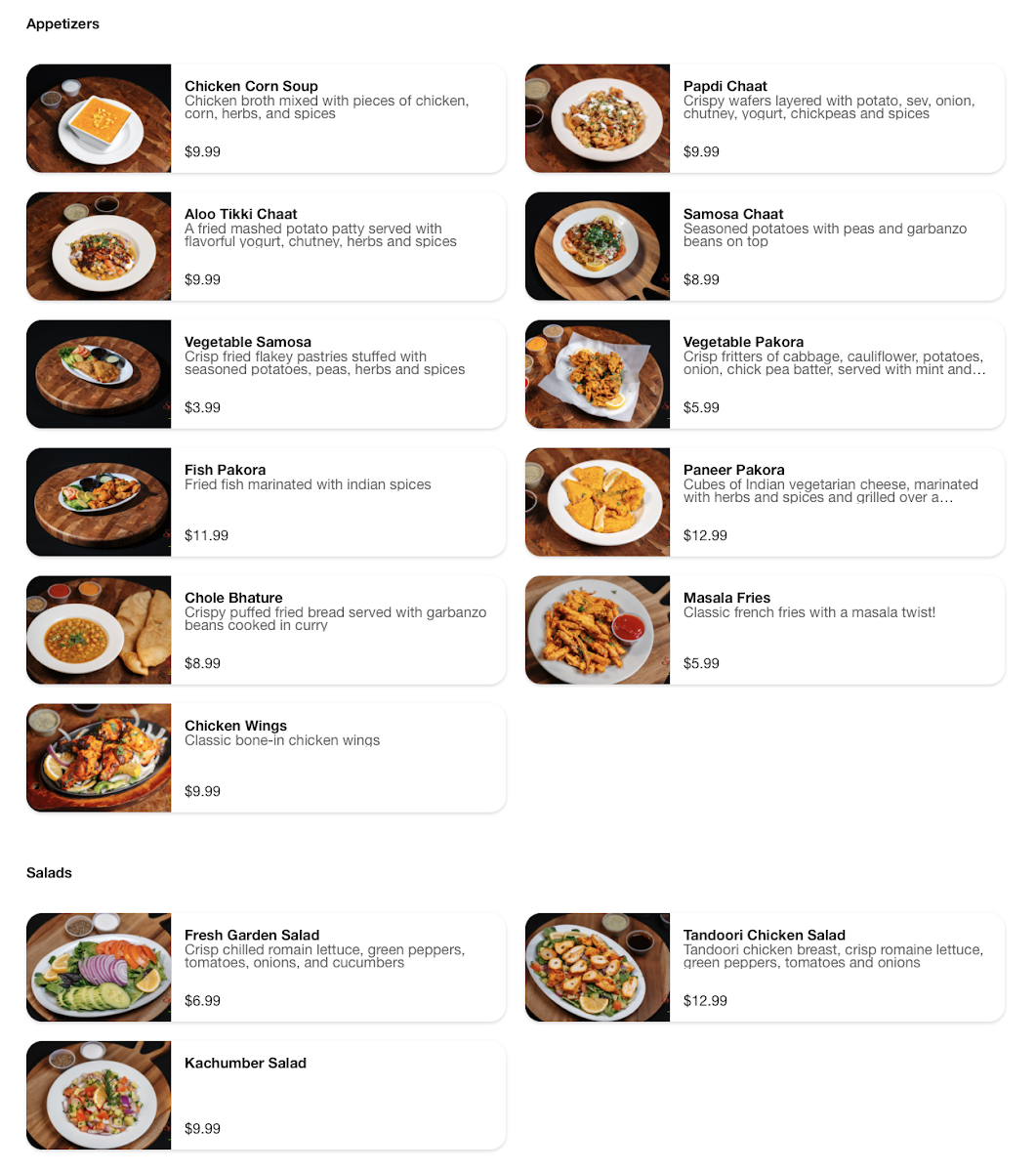Crisp fritters of cabbage, cauliflower, potatoes, onion, chick pea batter, served with mint and tamarind chutney
