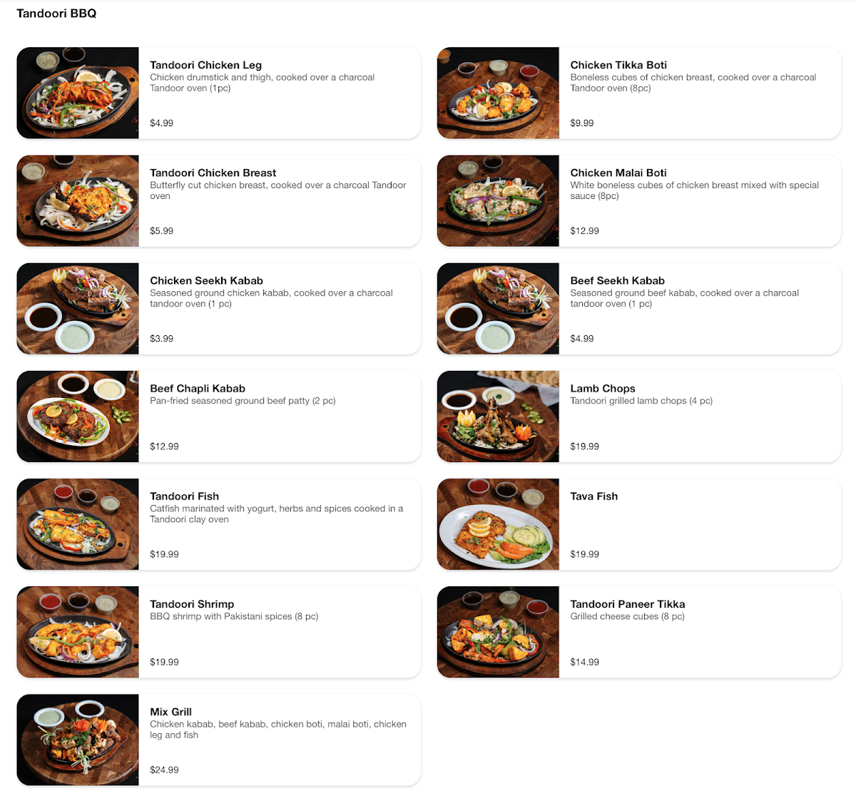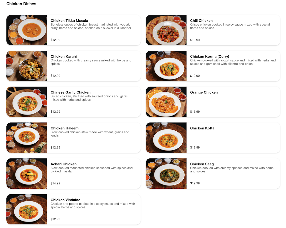 Boneless cubes of chicken breast marinated with yogurt, curry, herbs and spices, cooked on a skewer in a Tandoor clay oven, then prepared in a creamy tomato sauce