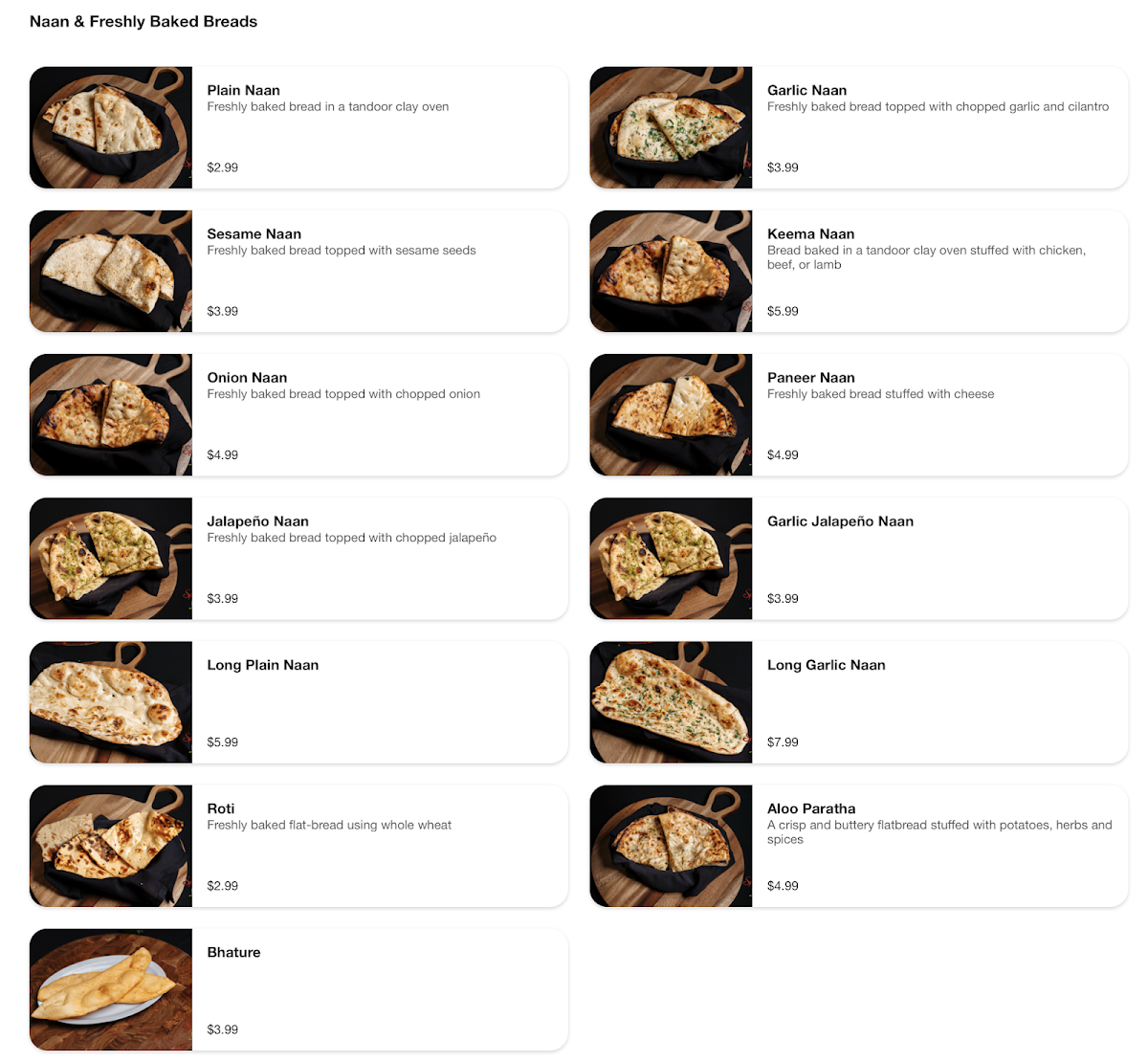 Bread baked in a tandoor clay oven stuffed with chicken, beef, or lamb
